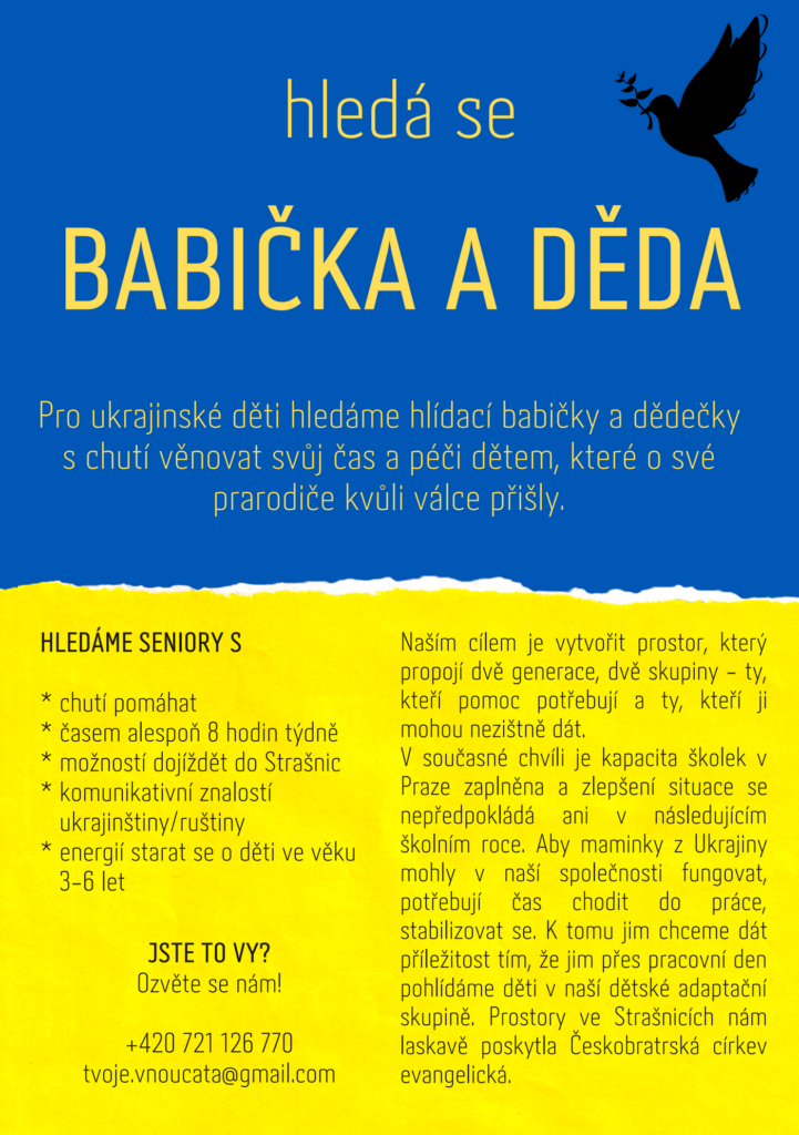 Základní informace od organizátorů zní: “Našim cílem je vytvořit v Praze adaptační skupinu pro děti ukrajinských uprchlíků, kteří v současné době stále přicházejí do České republiky. Chceme vytvořit prostor, ve kterém se budou setkávat dvě skupiny, generace, které by mohly těžit ze vzájemné společnosti – ukrajinské děti a senioři. V roli pečovatelů senioři naleznou milou společnost, zajímavou aktivitu a v neposlední řadě možnost pomoci a zapojit se do řešení současné nelehké situace. Součástí prostoru bude i sběrné místo s dětskými potřebami. Spolupracujeme s Českobratrskou církví evangelickou, která nám taktéž laskavě poskytla prostory ve Strašnicích.”