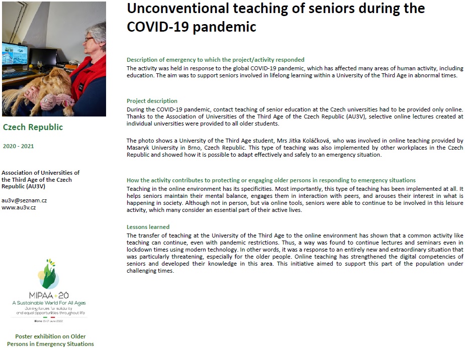 Ve dnech 15., 16. a 17. června 2022 se v Římě konala Ministerská konference o stárnutí 2022. Tuto akci organizovala Evropská hospodářská komise OSN (UNECE) ve spolupráci se Stálou pracovní skupinou UNECE pro stárnutí a italskou vládou. V rámci konference probíhala výstava posterů na téma „Older Persons in Emergency Situations“ – AU3V se prezentovala se svým posterem „Unconventional teaching of seniors during the COVID-19 pandemic“.