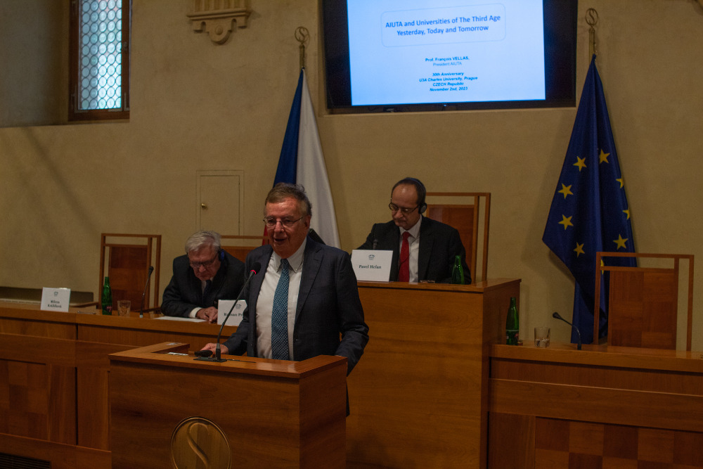 Následně přednesli příspěvky význační zahraniční hosté, prezident mezinárodní asociace univerzit třetího věku AIUTA prof. François Vellas z univerzity Capitole v Toulouse, prezidentka evropské federace seniorských studentů EFOS PhDr. Nadežda Hrapková, Ph.D. z Univerzity Komenského v Bratislavě a prezidentka Asociace univerzit třetího věku na Slovensku Ing. Lucia Hrebeňárová, Ph.D. ze Žilinské univerzity v Žilině.